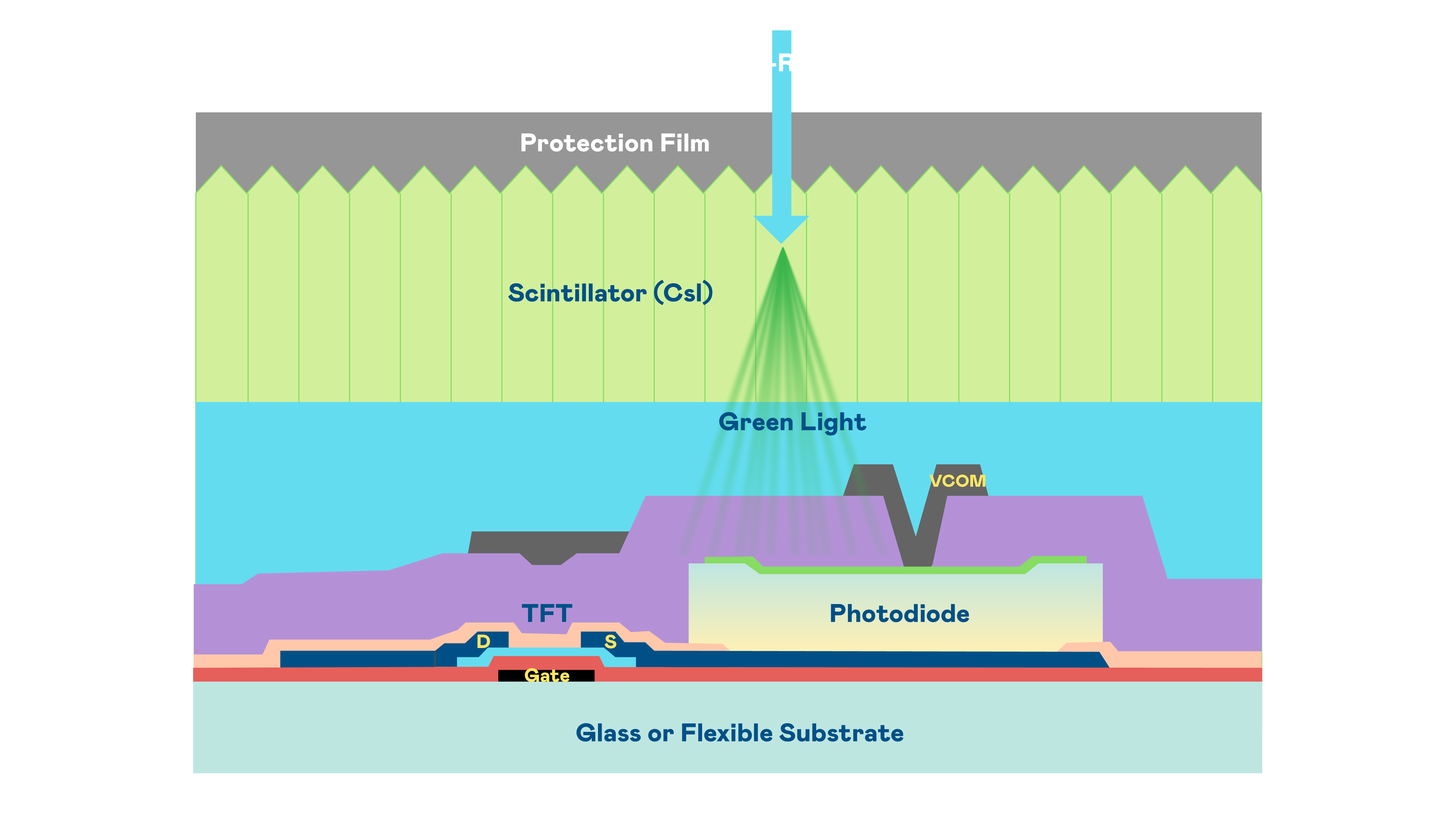 BG视讯的X光影像感測陣列使用薄膜電晶體 (TFT) 作為每個像素的讀取開關,搭配光電二極體(Photodiode)的光電轉換元件,用以感測X光影像訊號。
